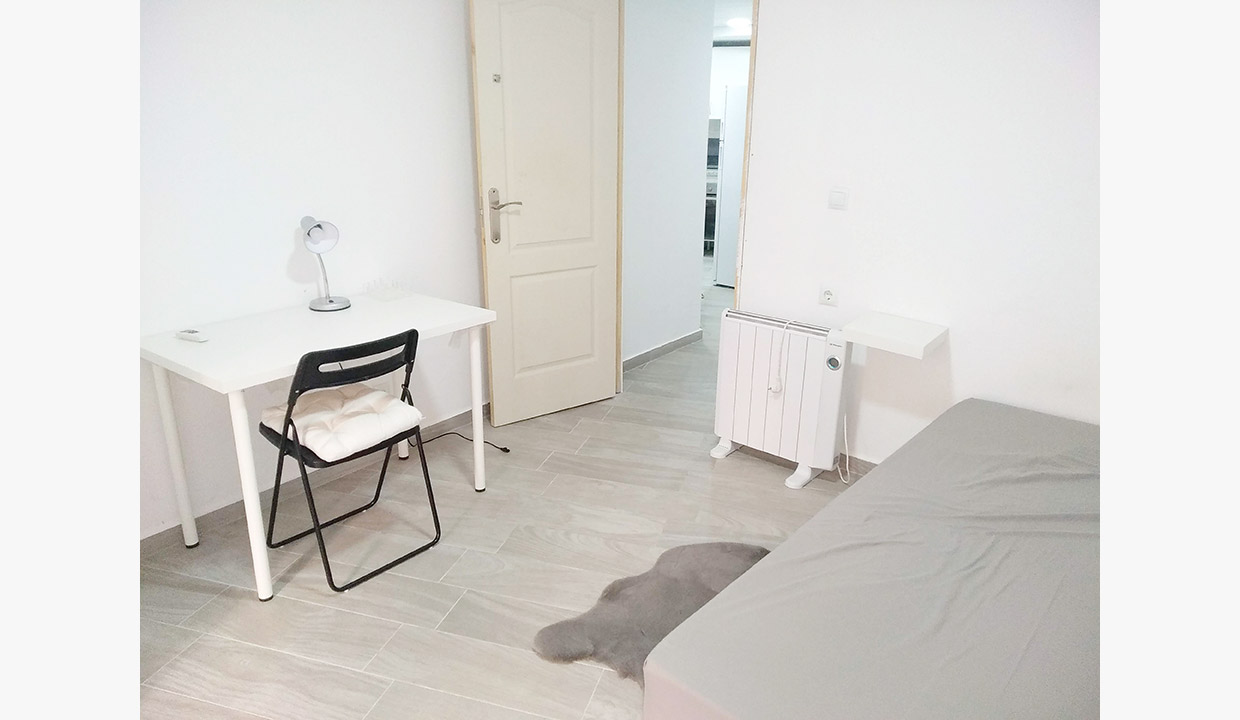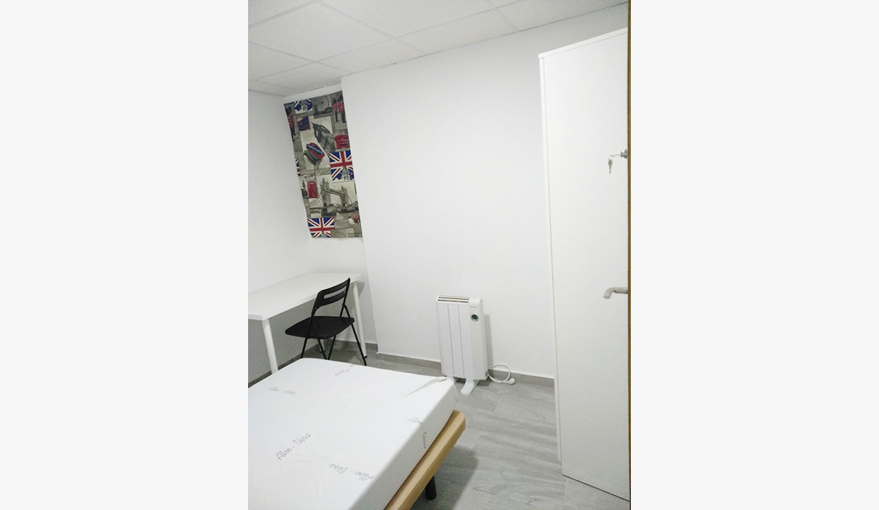 La vivienda, en particular, dispone de 3 habitaciones, un cuarto de baño y cocina office totalmente equipada (vitrocerámica, microondas, nevera, lavadora, horno…). Todas las habitaciones disponen de cerradura individual y están equipadas con cama y colchón de 1’05 m, armario, escritorio y silla, además dos de ellas tienen balcón al exterior y una ventana.